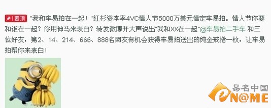 易名中国(eName.cn)2月14日讯,日前,据国内二手车电商品牌车易拍官方微博宣布,已获得新一轮5000万美元融资。本次投资由红杉资本领投,而在本次融资后,车易拍平台域名价值又将翻番,车易拍三拼域名cheyipai.com前景看好。