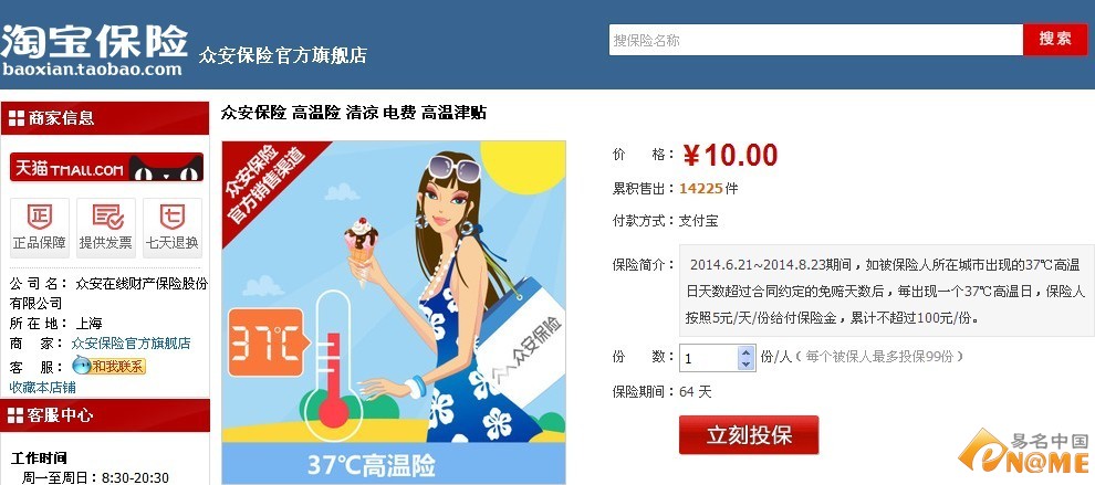 众安保险推37℃高温险 淘宝开售域名抢手