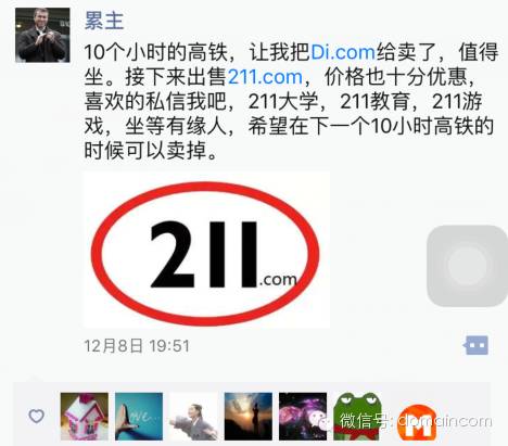 据爆料,前天,大神累主在朋友圈发了一条消息,已经高价售出di.com。累主说:“10个小时的高铁,让我把Di.com给卖了,值得坐。”大神就是牛啊,随时随地轻松卖米啊。