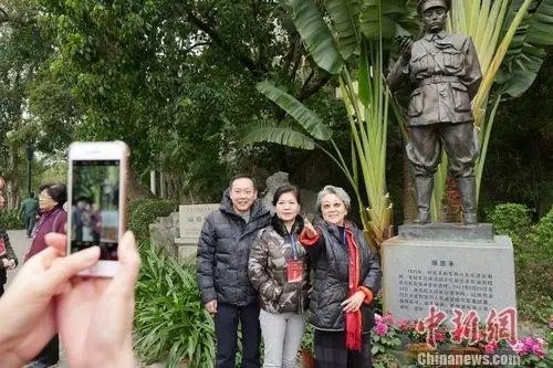 10日,周恩来侄女周秉德与亲属在广东省潮州西湖畔涵碧楼周恩来雕像前合影。
