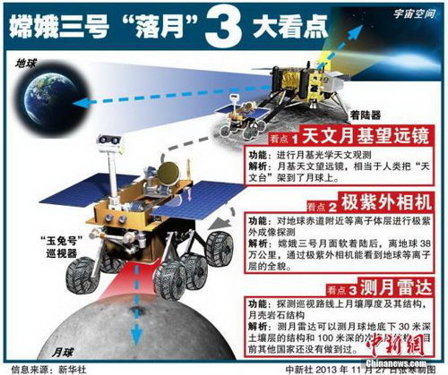 跟以往一样,接近年尾就是我们国家“捷报频传”的时候——这不,最近又传来特大喜讯:12月2日1时30分,搭载着嫦娥三号的长三乙运载火箭在西昌卫星发射中心发射升空。而就在今天凌晨4时35分又佳报频传,“嫦娥三号”着陆器和巡视器成功分离,“玉兔”驶进了月面。此次 “嫦娥三号”发射任务的主要环节是近月制动、变轨、软着陆和两器分离,另外,中国探月工程的下一步计划是从月球采样返回,将在2020年以前实现月球无人采样返回。